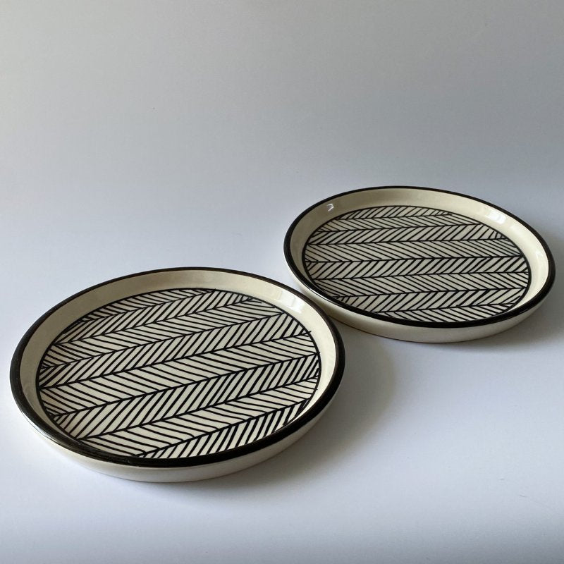 The classic off white handpainted ceramic small snacks plate which is ideal for your evening cookies, samosas, small portion of salads or sandwiches. These plates also serve the purpose of a dessert plate. The organic shape of this plate with slightest depth makes it an eccentric piece for your table.