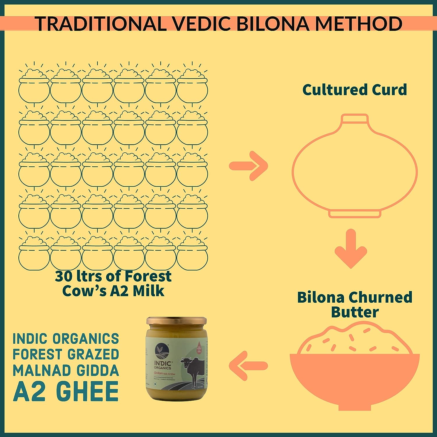 Indic Organics Forest Grazing Malnad Gidda Desi Cow's A2 Ghee can be used for cooking, sautéing, baking, or simply drizzled over meals to provide a touch of luxury and potential health advantages.